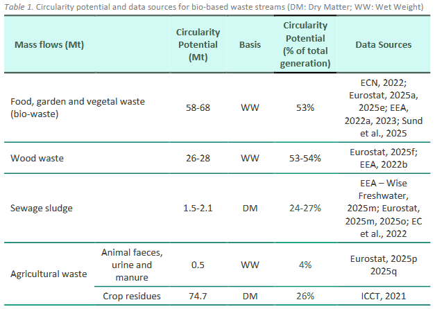 A new report by the EEA examines the potential to enhance the circularity of bio-based waste across Europe. Drawing in part on data from the ECN’s Status Report 2022, the analysis estimates that 58 to 68 million tonnes of food, garden and vegetal waste are currently not recycled. This represents around 53% of total generation in Europe, highlighting a substantial untapped resource for biological treatment. The figure below presents the estimated potentials across the different waste streams assessed.