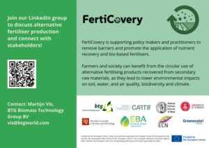 FertiCovery is funded by Horizon Europe and the consortium is coordinated by BTG Biomass Technology Group and composed of Fundación CARTIF, Ethnicon Metsovion Polytechnion, Università degli studi di Torino, Politechnika Wrocławska, European Biogas Association, European Compost Network and Greenovate ! Europe.